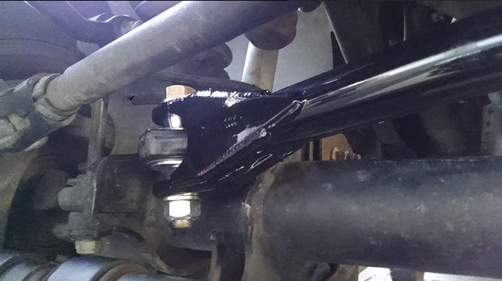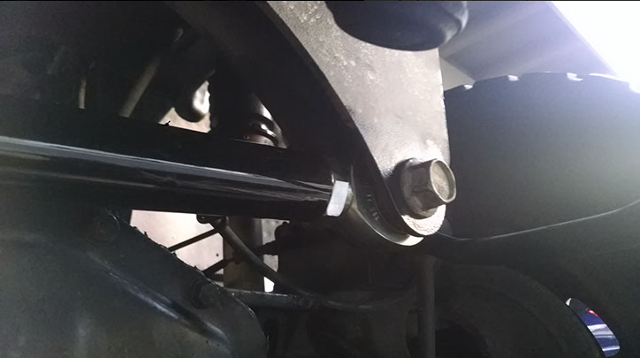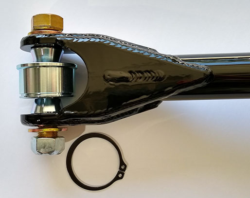 Our design incorporates a 1″ uniball set inside a custom cup assembly that (like the stock balljoint) is pressed into the original stock axle location. Our uniball setup allows the use of a double shear bar mount without having to move the pivot from it’s stock location. At the frame mount we use a 1″ hiem instead of rubber or polyurethane bushing. The bar itself is 1-5/8 OD x 1/4 thick DOM tube and the plating at the axle mount equates to a 7/16″ thickness per each bolt tab.